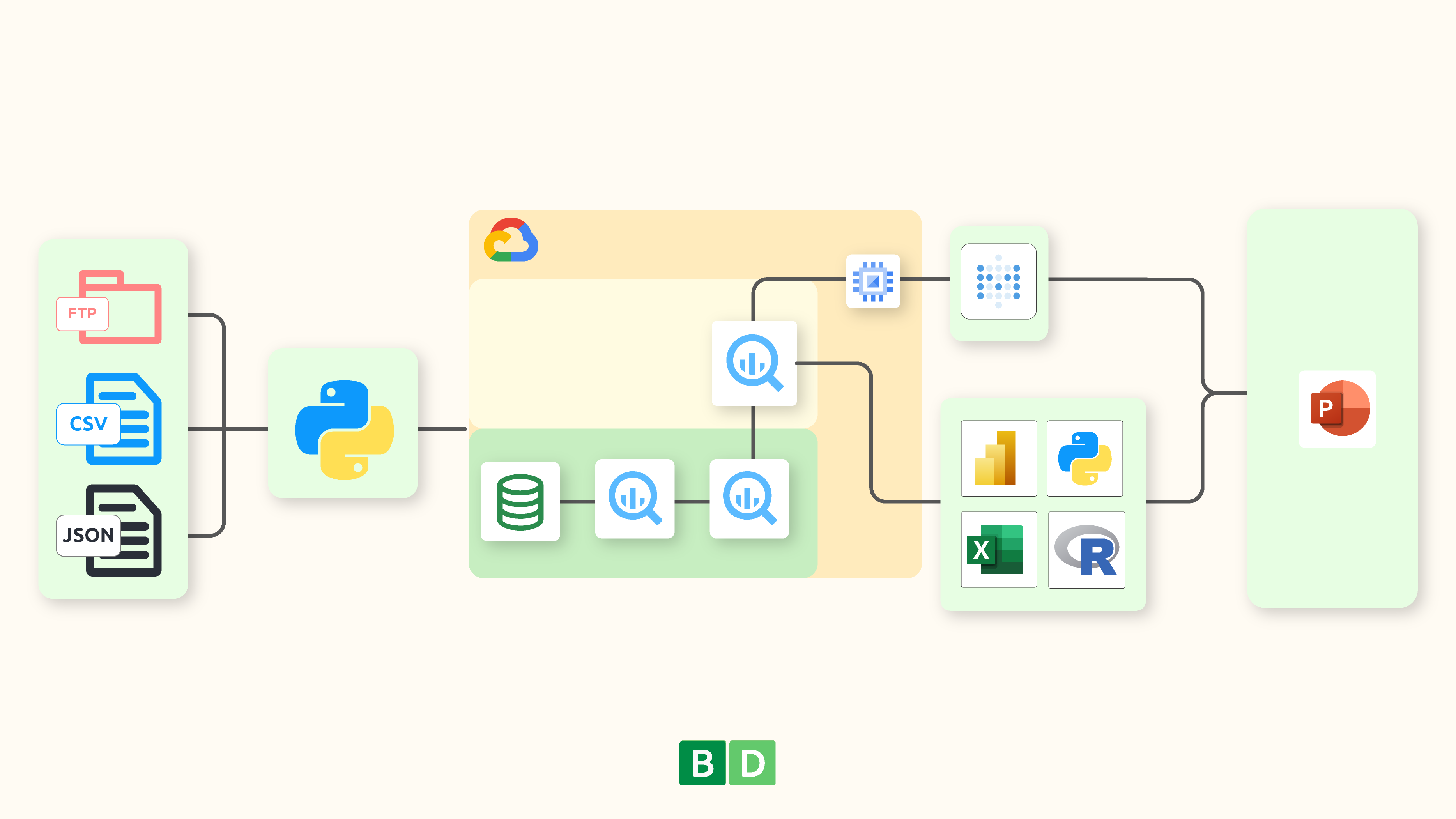A infraestrutura foi configurada na Google Cloud Platform (GCP), uma plataforma segura, de baixo custo e fácil acesso. Todos os dados de interesse do cliente foram disponibilizados em um único projeto no BigQuery para a centralização dos dados.